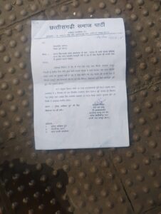 नारेबाजी किया जावेगा भी अंकित की गई है जिसके तहत उक्त दिनांक को छत्तीसगढ़िया समाज पार्टी के पदाधिकारी चेतन देवांगन जागेश्वर प्रसाद शिवनारायण ताम्रकार आदि लोगो की उपस्थिति में धरना प्रदर्शन किया गया। साथ ही कलेक्टर जनदर्शन में भी आवेदन किया गया है।