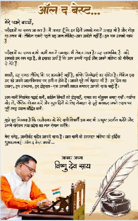रायपुर, मुख्यमंत्री श्री विष्णु देव साय ने विद्यार्थियों को शुभकामनाएँ देते हुए कहा — “ऑल द बेस्ट, प्यारे बच्चों।”