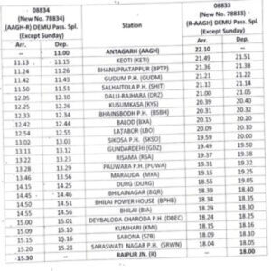 दक्षिण पूर्व मध्य रेलवे के रायपुर रेल मंडल के अंतर्गत 08834/08833 अंतागढ़-रायपुर-अंतागढ़ डेमू पैसेंजर स्पेशल ट्रेन सेवा का परिचालन का अंतागढ़ रेलवे स्टेशन से 7 जुलाई, से शुभारंभ किया जा रहा है । इस गाड़ी को 8 जुलाई से नियमित समय सारणी के अनुसार गाड़ी संख्या 78834/78833अंतागढ़-रायपुर-अंतागढ़ डेमू ट्रेन सेवा सप्ताह में छह दिन (रविवार को छोड़कर) दोनों छोर से अंतागढ़ और रायपुर से संचालित की जाएगी
