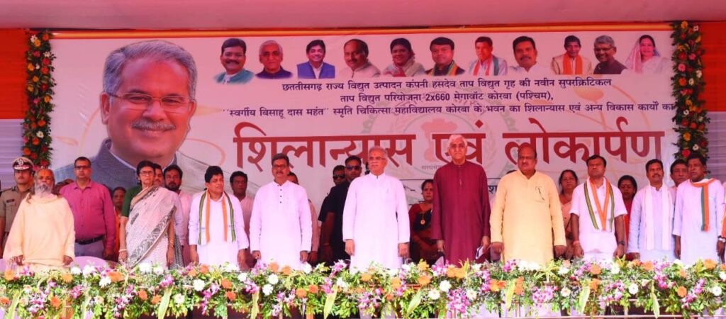 मुख्यमंत्री श्री भूपेश बघेल ने आज कोरबा जिले के एक दिवसीय प्रवास के दौरान कोरबा के घण्टाघर मैदान में आयोजित कार्यक्रम में विभिन्न कार्यों का शिलान्यास और लोकार्पण और भूमिपूजन किया। इस अवसर पर मुख्यमंत्री ने छत्तीसगढ़ राज्य विद्युत उत्पादन कंपनी हसदेव ताप विद्युत गृह की नवीन सुपरक्रिटिकल ताप विद्युत परियोजना कोरबा (पश्चिम) का शिलान्यास किया। इसकी अनुमानित लागत 12 हजार 915 करोड़ रूपए है। श्री बघेल ने विभिन्न विभागों के अंतर्गत किए जा रहे 72 विकास कार्यों का भी लोकार्पण, भूमिपूजन और शिलान्यास किया जिसकी लागत 112 करोड़ 13 लाख से भी अधिक है। इन कार्यों में 54 करोड़ 70 लाख राशि के 38 विकास कार्यों का लोकार्पण एवं 57 करोड़ 43 लाख से अधिक राशि के 34 विकास कार्यों का शिलान्यास कार्य शामिल हैं। मुख्यमंत्री ने यहां कलेक्टरेट परिसर में छत्तीसगढ़ महतारी की मूर्ति का अनावरण एवं डिंगापुर में नवनिर्मित ई-लाईब्रेरी का लोकार्पण किया।